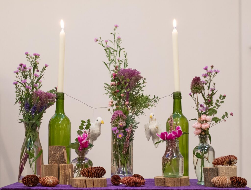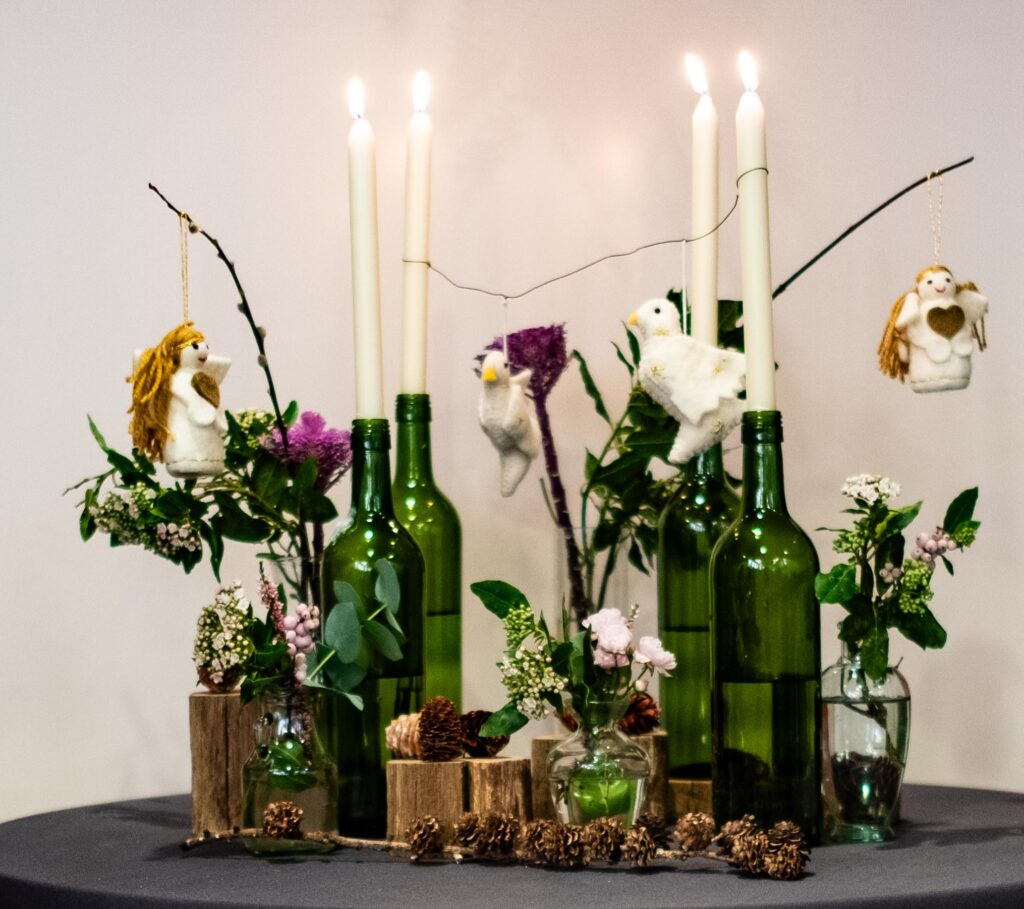 In de flesjes en op de boomstammetjes staan nu ook roze materialen. Het donker wordt doorbroken, een feestelijke kleur gloeit op.