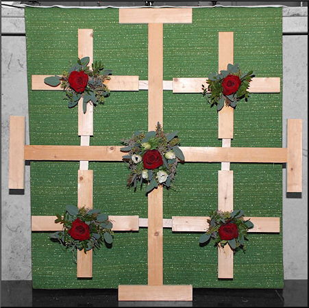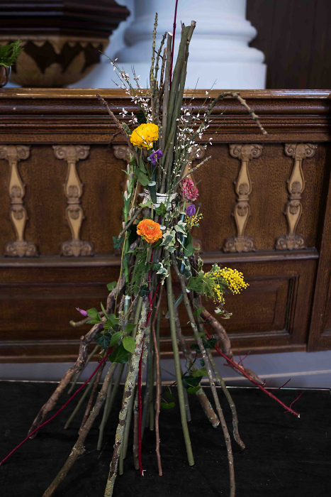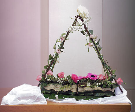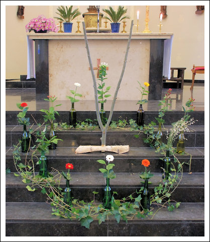 Het kruis, symbool van het christelijk geloof, bestaat uit schijnbaar dode takken. De bloemetjes vertellen van leven.
