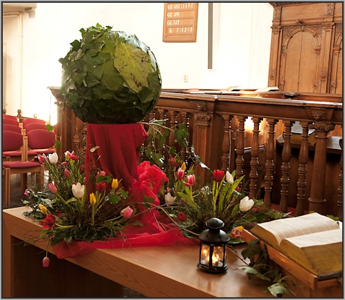 Wij zijn verbonden met elkaar door het gebed, de witte tulpen verwijzen daarnaar.
