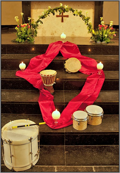 Rood is de kleur van de Geest. Verwijst ook naar offer, martelaarschap en lijden